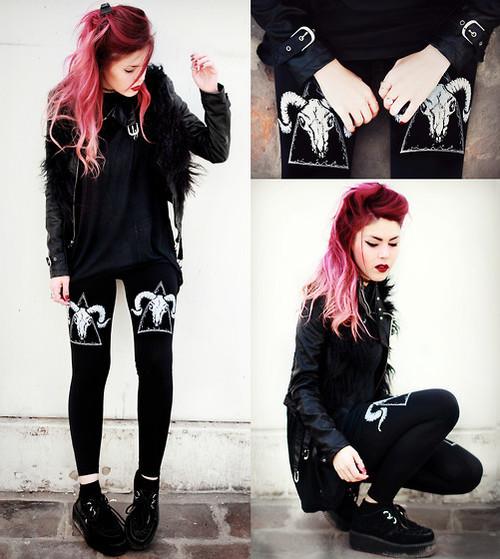 Cabelo. Um cabelo preto ou muito escuro complementa muito bem com o resto do vestuário, seja uma cor natural ou pintado numa cabeleireira, ou inclusive uma peruca. Pode incluir mechas de alguma cor diferente, como branco, roxo ou vermelho, para criar mais contraste e dar um toque diferente ao seu look.