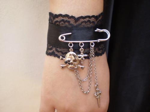 Bijuteria. Anéis, brincos, colares, pulseiras, pingentes, braceletes e tudo o que possa imaginar. Existe uma infinidade de complementos de bijuteria com motivos góticos que podem servir perfeitamente para a fantasia: caveiras, aranhas, serpentes, partituras, etc. Não obstante, também pode utilizar o contraste e usar complementos com formas inocentes, como corações ou flores, mas ficará melhor se for em preto.