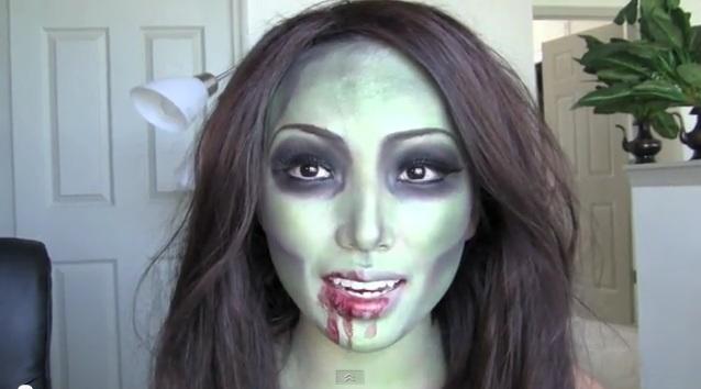 Você também pode montar rapidamente uma fantasia de zumbi. Para a fantasia de zumbi você não tem que se preocupar muito com a roupa, escolha peças de roupa casuais, de preferência um pouco velhas e faça alguns rasgos nelas. Agora onde você deve caprichar mais é na maquiagem, para parecer um autêntico zumbi. Faça sangue falso e aplique pelo rosto, aplique pó facial ou talco e contorno os olhos de com sombra preta, como o zumbi na imagem.