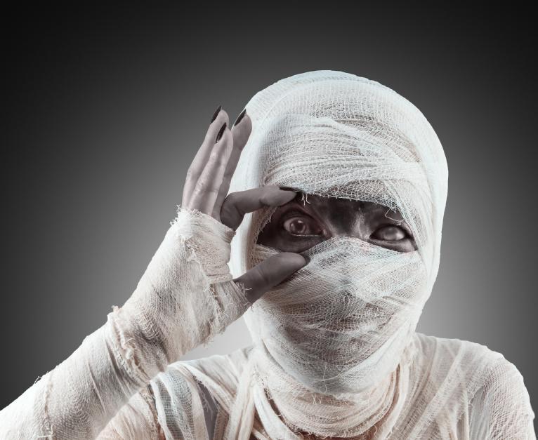 Outra das melhores opções para fazer uma fantasia de Halloween original é envolver todo o seu corpo e encarnar uma múmia recém saída do sarcófago. Trata-se de uma das fantasias que podem ser mais elaboradas mas, a verdade é que fazê-la é muito simples pois só precisará de roupa branca e de vários rolos de ataduras que servirão para cobrir o seu corpo.