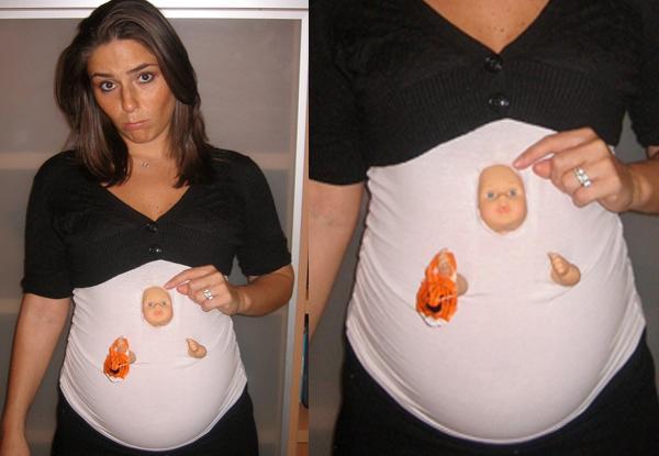 Além disso, fazer esta fantasia é super simples! Terá apenas que pegar num boneco, cortar-lhe as pernas, os braços e a cabeça (se quiser, caso contrário apenas com as mãos e os pés já conseguirá este efeito) e colá-los sobre uma camiseta branca como se o bebê estivesse saindo da barriga. Para dar uma aparência mais realista, salpique um pouco de tinta vermelha ao redor das peças assim como pela camiseta.