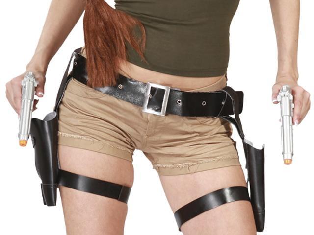 Compre dois coldres de perna ou então faça-os você mesma, utilizando tiras de elástico ou velcro. Consiga também duas armas de plástico pretas para colocar nos coldres. Caso não consiga ou não tenha armas pretas, pode sempre pintá-las de preto com tinta spray.