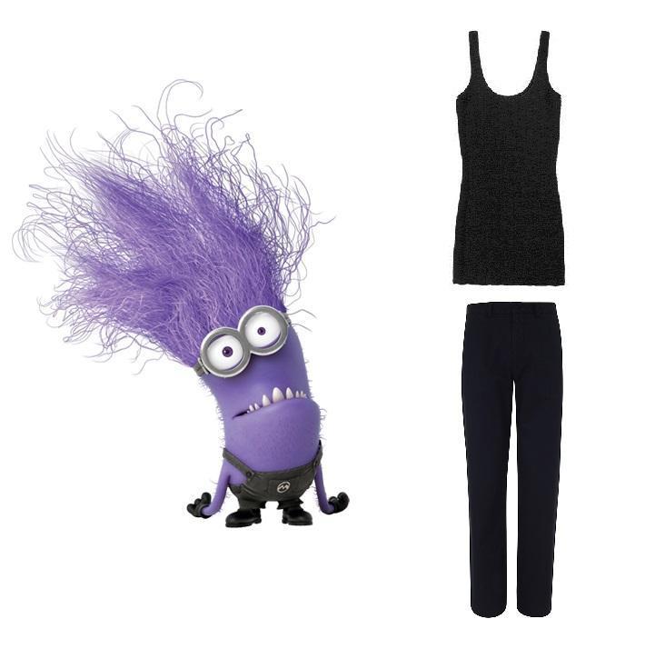 Neste caso os minions roxos aparecem com macacão preto, sapatos e luvas também pretas. Se tiver uma jardineira escura ficará ideal para a sua fantasia de minion roxo. Se não, propomos que você utilize uma calça preta e uma camiseta de alças também preta. Se escolher esta última opção deverá costurar dois botões no início de cada alça para simular a jardineira. Se puder danificar a camiseta, pode cortar as alças, fazer um pequeno corte e segurar com o botão, como se fosse o macacão.