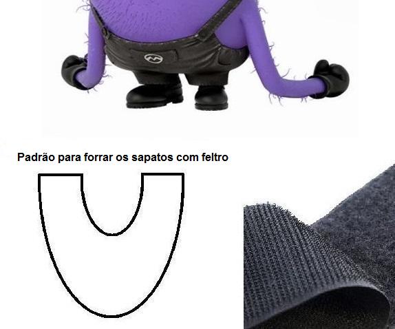 Agora, é a vez dos sapatos. Se não tiver sapatos pretos a forma mais simples de fazê-los é com feltro preto. O que faremos será forrar uns sapatos que tenhamos para simular os do minion roxo. Como? Muito simples. Primeiro, pegue as medidas de seu sapato, tanto da largura quanto do comprimento. Para isso, não é necessário uma fita métrica de costura, basta colocar o feltro sobre o sapato ajustando-o ao mesmo. Quando o cobrir, pegue um marcador de uma cor que não seja preta e desenhe a forma do sapato. Quando tiver desenhado pode retirá-lo, verá que ficou um padrão em forma de U, recorte-o. Agora, coloque um pouco de velcro para unir os dois extremos assim poderá colocar e tirar quando quiser. Simplesmente corte uma tira e costure o lado macho em um dos extremos e a parte fêmea do outro. Repita todo o processo para o outro sapato e pronto!