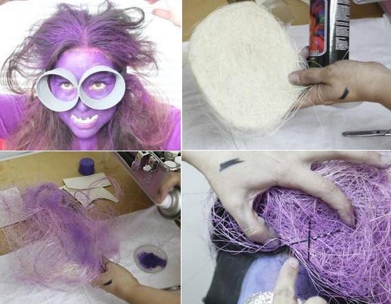 Só falta o cabelo. Se for uma garota é fácil, você só precisa pentear todo seu cabelo e, com a ajuda de um gel fixador, colocá-lo para cima ou em várias direções, mas descontraído. Depois, com spray para pintar o cabelo de roxo, especial para fantasias para que desapareça ao lavar, tinja todo o cabelo. Se for um menino com cabelo curto você tem duas opções: comprar uma peruca e fazer o mesmo processo (pentear e tingir) ou criá-la. Para fazê-la você mesmo, pode utilizar bucha de fibra. Já que costuma ser branca, você deverá tingi-la de lilás e separar as fibras. Depois, prenda-a em seu cabelo com grampos por partes, assim você criará o efeito despenteado do minion roxo. Sua fantasia de minion roxo já está pronta!