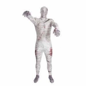 - A primeira coisa que precisa para fazer uma fantasia de múmia caseira é uma camiseta de mangas compridas branca e calças leggings também brancas. Pode usar qualquer peça velha que tenha no seu armário e é preferível que fiquem bem justas ao corpo. E, é claro, você precisará comprar uns rolos de ataduras para se cobrir por completo, outra opção é fazer fantasia de múmia com papel higiênico.As múmias, recém saídas do seu túmulo, onde estiveram enterradas durante milhares e milhares de anos, são sujas, velhas e terroríficas. Para que que fantasia de múmia seja real, recomendamos-lhe cortar as ataduras em tiras bastante compridas e mergulhá-las num infusão de chá ou café frio para ficarem com um aspeto velho e sujo. Deve deixá-las secar durante toda a noite.