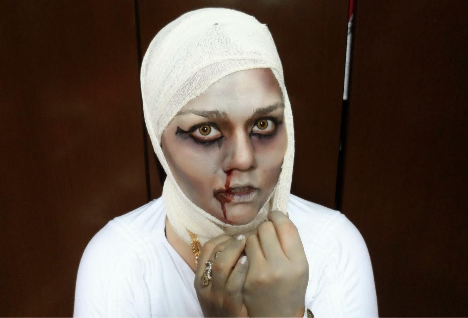 Assim que toda a roupa estiver pronta, é hora de fazer a maquiagem. Para fazer a maquiagem de múmia, você deverá acima de tudo se atentar aos olhos, que deverão estar bastante marcados, valendo até mesmo fazer círculos em volta como que simulando uma olheira bastante forte. Ainda nos olhos, você poderá completar o visual com um rímel, o que dará ainda mais destaque à região. Para a pele, é importante adicionar um tom pálido, que poderá ser feito com sombra branca ou com uma base bastante clara, também valendo adicionar algumas manchas escuras que combinem com o "sujo" da fantasia. Você também pode utilizar essas dicas para fazer maquiagem de zumbi com papel higiênico.