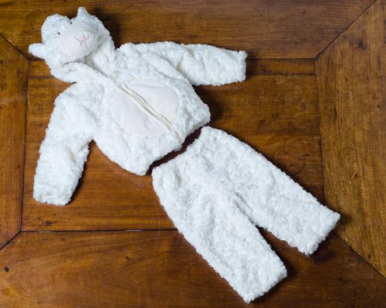 Para tornar a nossa fantasia de ovelha ainda mais real, pode utilizar tinta marrom e fazer algumas manchas no vestido para simular as manchas de lama.