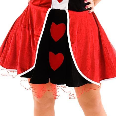 De seguida, faça uma espécie de 'avental' que colocará por cima do vestido da fantasia de rainha de copas. Com cetim ou outro tecido idêntico recrie a parte de cima da saia, como pode ver na imagem acima. Deve utilizar cetim vermelho para a roda da saia e deixar um espaço ao meio, de maneira a que se veja o tecido preto do vestido, costure uma barra branca no final da saia e duas faixas ao alto que percorram o vestido todo e atem depois atrás do pescoço. Se quiser, também pode costurar estas duas faixas brancas na parte de cima do vestido. A barra branca e as faixas ao alto podem também de cetim ou renda, o que preferir.