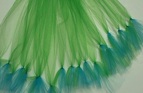 Agora vamos fazer a cauda da sereia. Para a cauda precisa de tecido de lantejoulas verde, este tecido é ideal porque assim consegue simular as escamas. Recorte este tecido em forma de cauda, o tamanho da cauda dependerá do tamanho da pessoa que vestir a fantasia. Mas, lembre-se que a cauda vai ser costurada no vestido e deverá ficar a arrastar ao chão. Deverá reforçar a cauda com um forro de cetim verde, para ficar mais consistente.