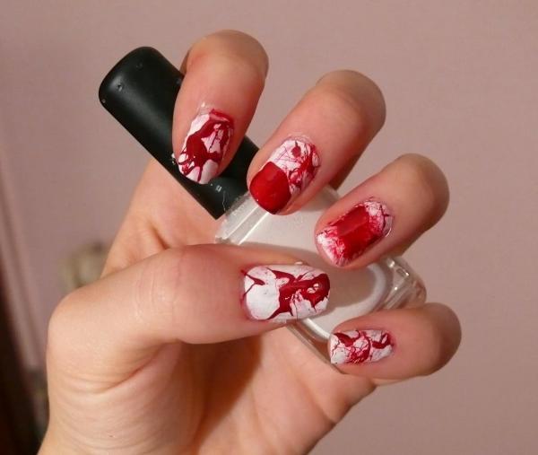Se o que você procura são opções super simples para decorar as suas unhas no Halloween, a seguinte é perfeita para si. Em poucos minutos, conseguirá tê-la pronta. Trata-se de um desenho muito sangrento que pode servir para qualquer fantasia ou look. Terá apenas que aplicar uma primeira camada de esmalte branco sobre as unhas e, quando este tiver secado, deixar cair pequenas gotas de esmalte vermelho ou granada sem o arrastar. Incline o dedo para que a pintura se espalhe e o efeito final seja o mais real e autêntico.