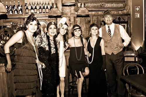 Por último, terá que definir um dress code para criar o ambiente apropriado. As mulheres terão que se vestir com um vestido na altura dos joelhos e de corte na altura do quadril com plumas, lantejoulas e decoração com franjas. Também terá que usar acessórios como colares de pérolas, chapéus, tiaras, ou pode inclusive apostar por pentear fazendo ondas. Finalize o conjunto com algum boá de plumas que dará um look sexy e maravilhoso. Os garotos poderão se inspirar na forma de vestir dos mafiosos, vestidos de terno de listras com gravata, ombros largos, suspensórios, chapéus e sapatos de couro.