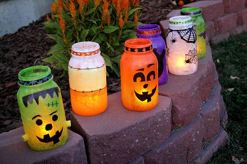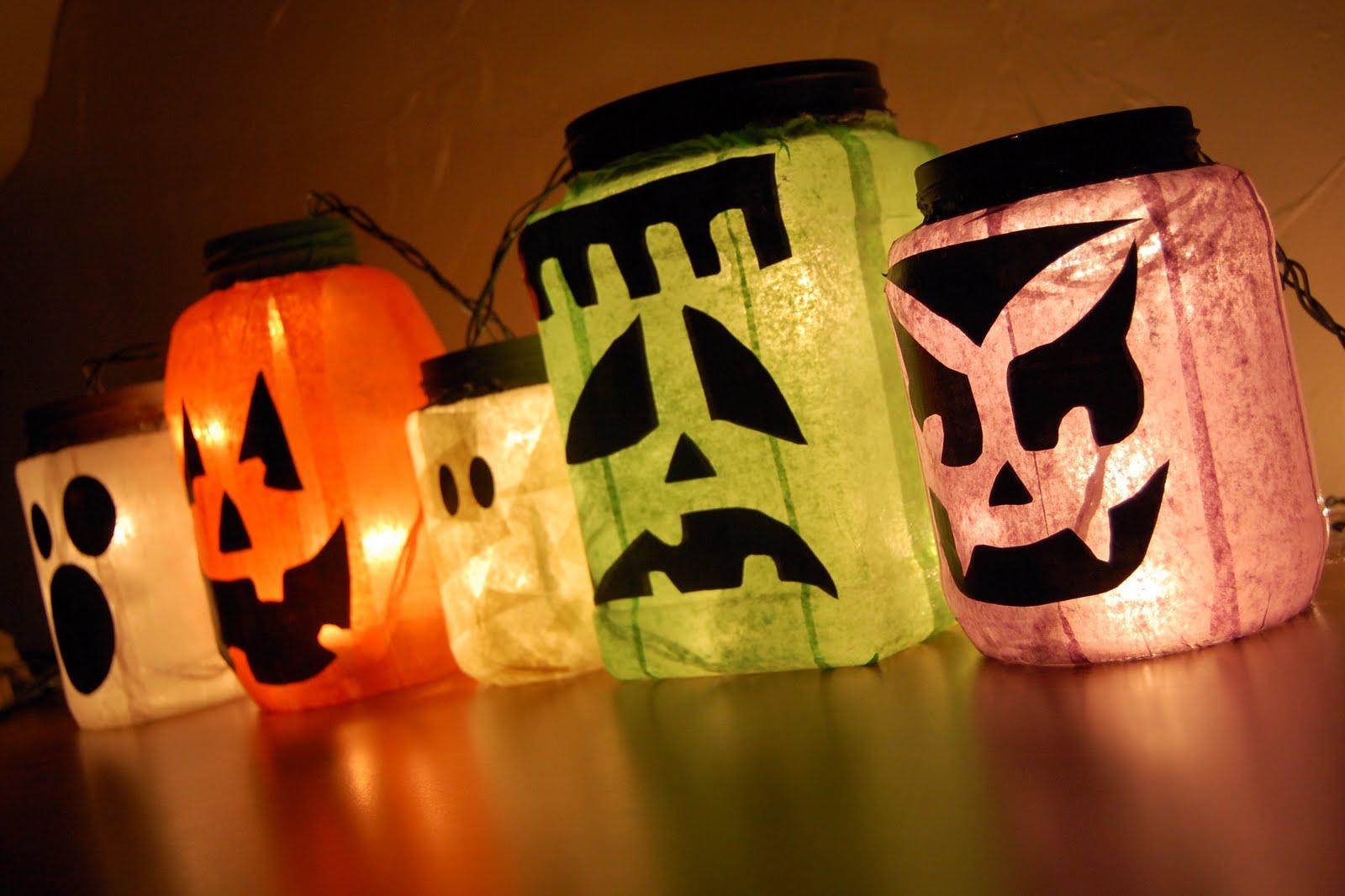 Uma alternativa econômica para fazer lanternas de Halloween é reutilizar vasilhames de vidro. Limpe-os bem e forre-os com papel colorido, de preferência seda para deixar passar a luz. Desenhe caretas em papel autocolante preto e cole no vasilhame. Coloque no interior velas e terá lanternas muito divertidas e coloridas.