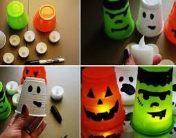 Com simples copos de plástico poderá fazer divertidas e originais lanternas para decorar a sua festa de Halloween. Consiga copos de plástico com diferentes cores e com um marcador desenhe caretas assustadoras neles. Lembre-se que deverá fazer os desenhos com o copo virado para baixo. Agora coloque um copo por cima de uma vela e já terá as suas lanternas de Halloween.