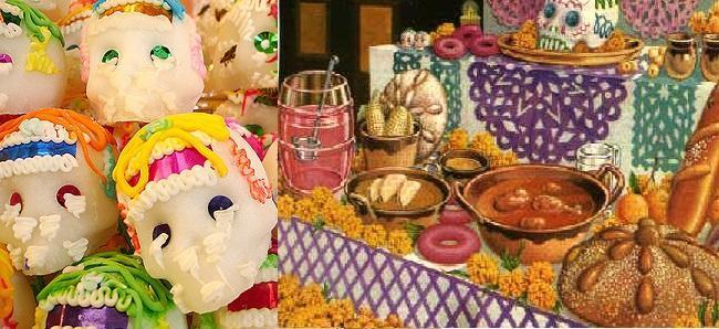 - Caveiras de açúcar, muito típicas desta festa junto com copos de água para que o defunto possa beber e para representar este elemento natural.