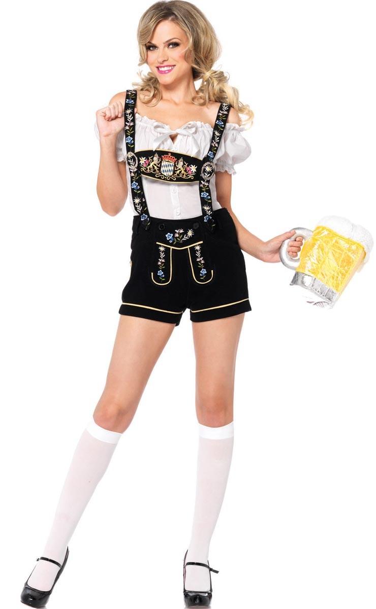 A lederhosen, que é mais conhecida por ser usada por homens, também tem versões femininas, que geralmente são confeccionadas em couro ou tecidos parecidos. o mais importante é respeitar o corte do modelo e, se possível, aderir a detalhes típicos como os bordados, a braguilha e os botões. O comprimento mínimo aceito em festas oficiais é na metade da coxa.