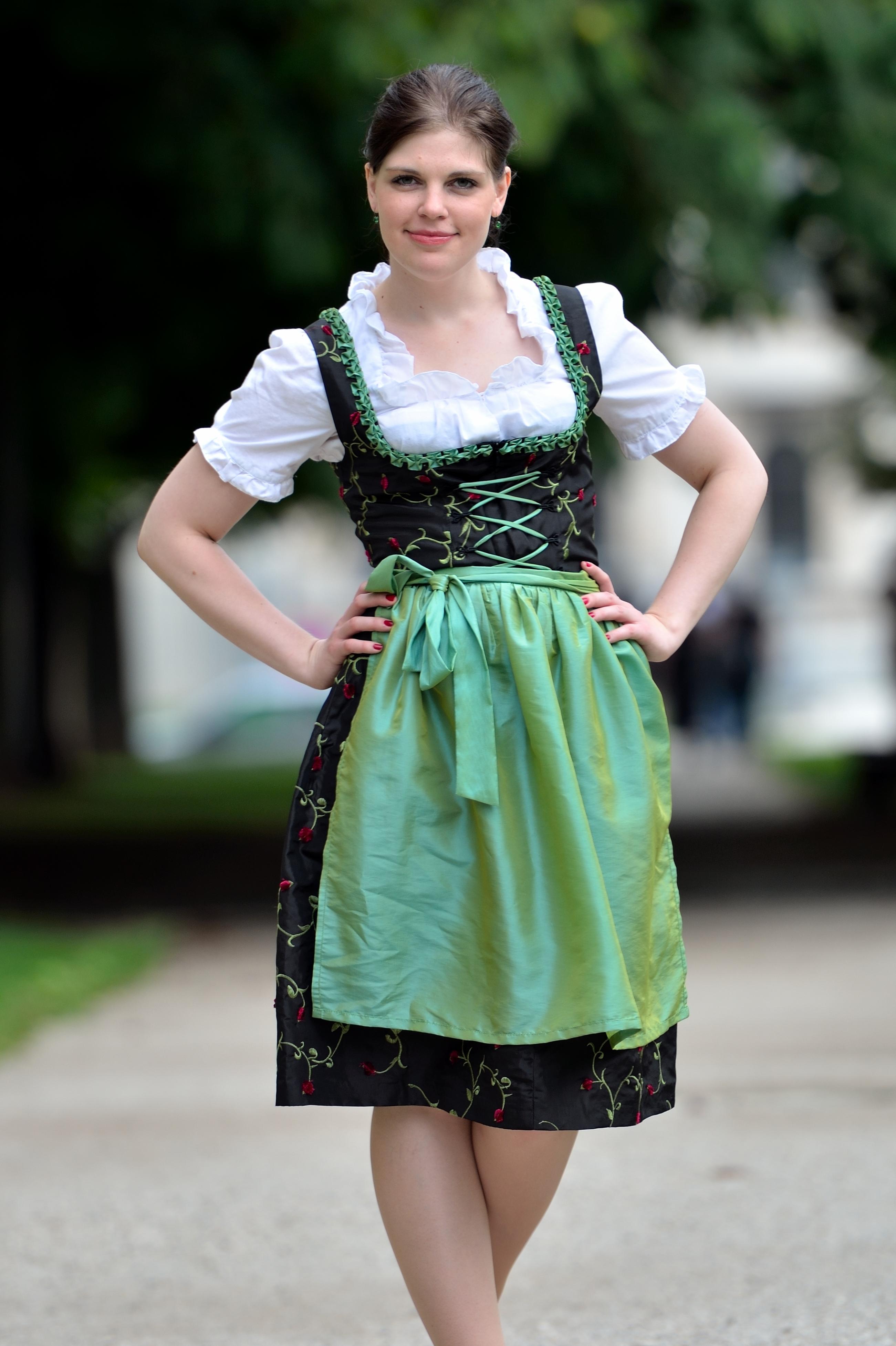 - Vestido ou saia godê: os originais são longos ou na altura do joelho em cores variadas, podendo ter detalhes dourados e motivos floridos, sendo normalmente de cintura alta. Apesar de existirem modelos mais curtinhos, os eventos oficiais, como a Oktoberfest, para desconto na entrada toleram o comprimento mínimo de 4 dedos acima do joelho;
