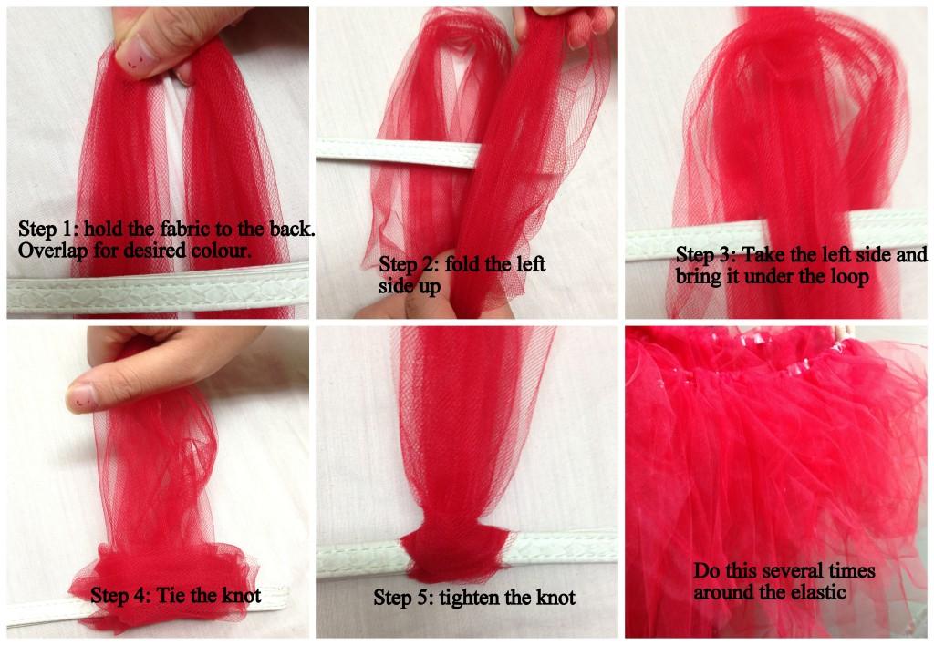 - Agora passe as pontas da tira de tule por dentro da argola formada e dê um nó, tal como mostra na imagem. Continue adicionando as tiras de tule dessa forma até ter a fita de cetim (ou o elástico) preenchida. Lembre-se de deixar um pedaço de fita vazio, que servirá para amarrar a saia à volta da cintura. Você pode colocar as tiras de tule todas da mesma cor ou ir intercalando várias cores;
