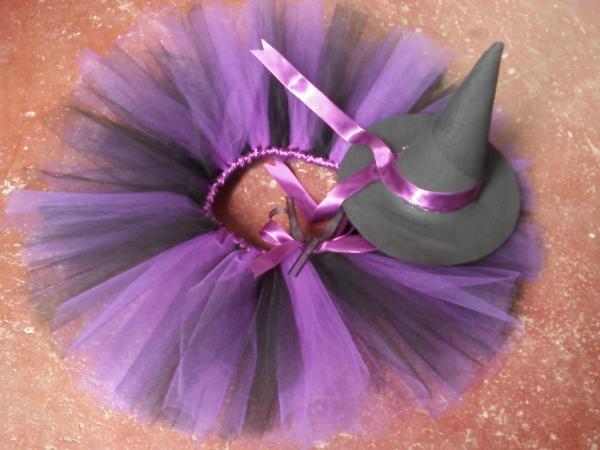 Para a saia de bruxa de tule, basta seguir as mesmas instruções acima, mas usando um tule de cor mais escura (preferencialmente preto e roxo).