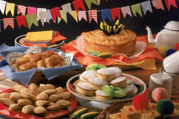 Comida. Esta é a parte mais gostosa de toda a festa junina. Pode fazer um cardápio variado e pedir aos seus convidados para levarem algum prato típico, assim todos colaborarão para a festa e terá um cardápio mais variado. Alguns pratos doces que não podem faltar numa festa junina são canjica, pé de moleque, arroz doce, pipoca doce, curau de milho, cocada e bolo de fubá. Quanto aos pratos salgados não se esqueça de cachorro quente, caldo verde, cuscus, espetinho de churrasco, milho verde e pinhão. Para as bebidas certifique-se que tem quentão e vinho quente.