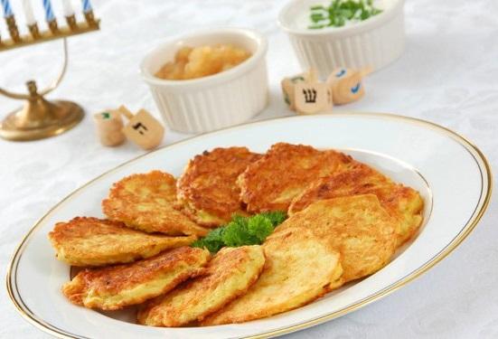 Um dos pratos típicos é chamado de latkes, e consistem em panquecas de batata, unidas com leite e ovos e fritas em óleo. Durante a refeição os latkes se comem acompanhados de creme de leite ou molho de maçã.