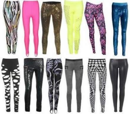 Para fazer sua fantasia de roqueira caseira precisará de leggings de preferência estampadas com motivos como estampas de animais, ou listras. Escolha também leggings de uma única cor, jogando com tons da época como as cores fluorescentes.