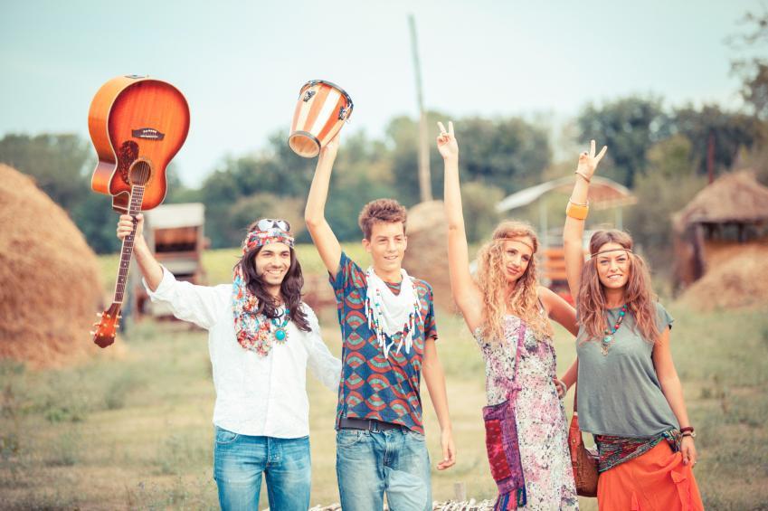 Flower power! Os anos 60 foram a década dos maiores movimentos hippies, por isso esta é uma ótima opção para ambos os sexos. Cabelo longo, calças boca de sino, roupa solta, jeans, sandálias, flores e o imprescindível símbolo da paz completam um total look em toda cor.