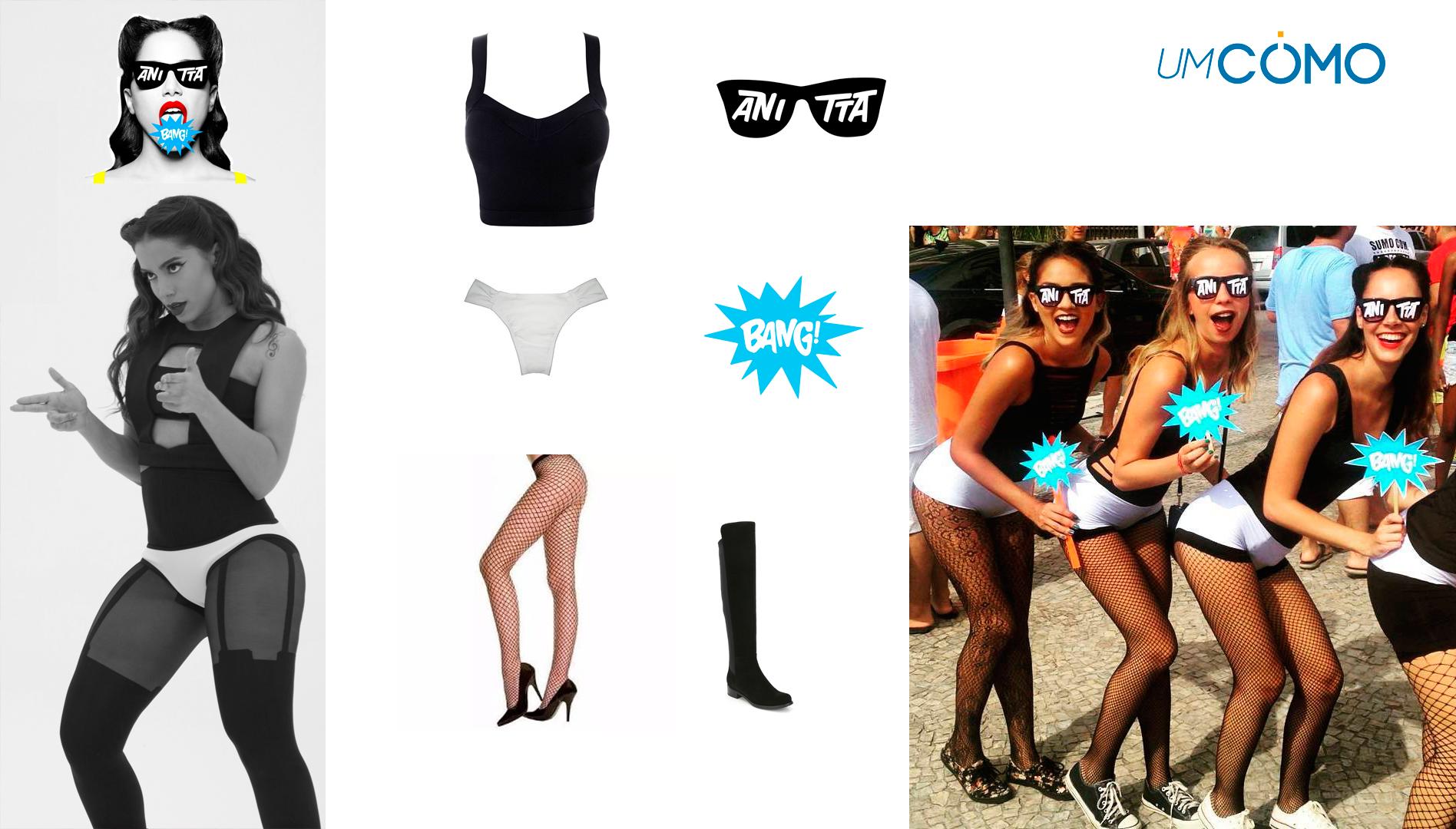 - Para o cabelo, penteados meio-preso e topetes alcançam o efeito. Faça como se sentir mais confortável e estará prontísima a sua fantasia de Anitta em Bang.
