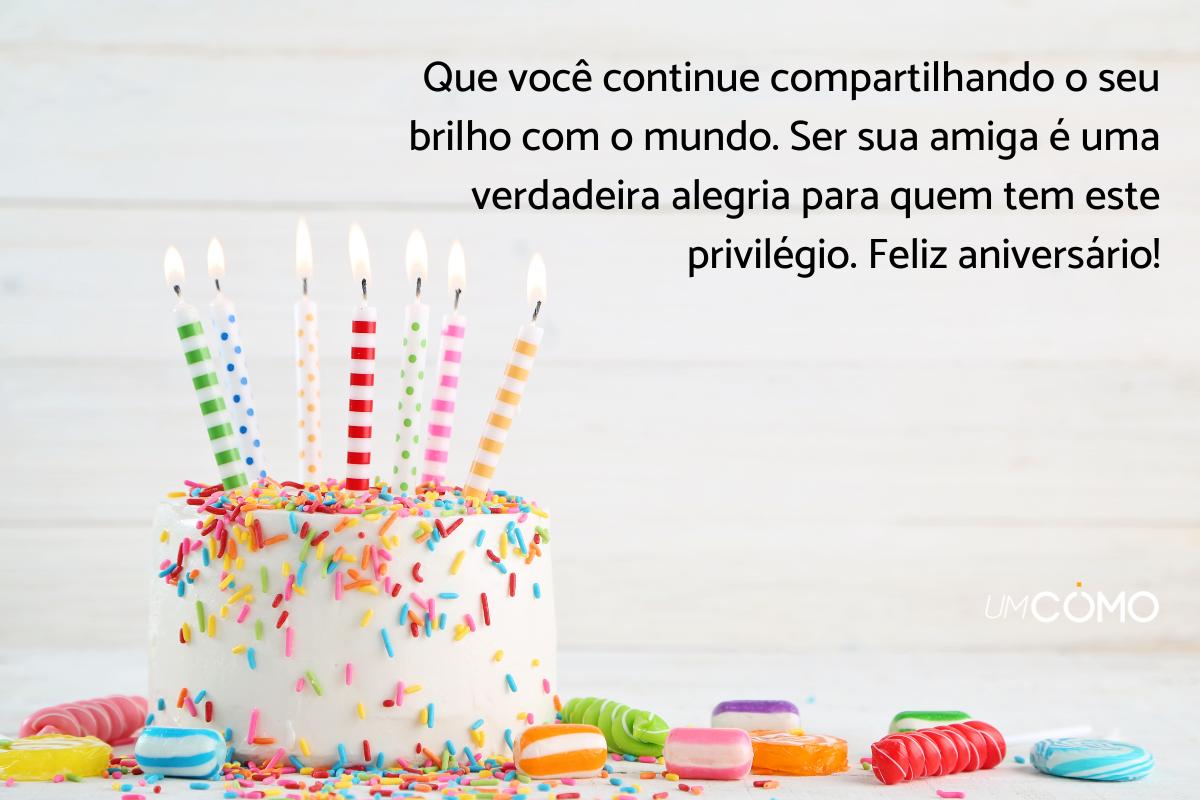 - Que você continue compartilhando o seu brilho com o mundo. Ser sua amiga é uma verdadeira alegria para quem tem este privilégio. Feliz aniversário!