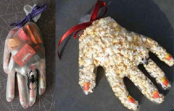 Se quer ter êxito com todas as crianças, tem que fazer umas mãos de monstros com caramelos, guloseimas e pipocas. Coloque um recipiente cheio de doces, outro com pipocas e ao lado uma caixa de luvas de látex, isto será tudo o que necessita para fazer umas mãos de monstro para o Halloween. Dê a cada criança uma luva aberta, para isso sopre para o interior da luva para ficar aberta. Para as luvas ficarem com formas diferentes, encha-as de pipocas e caramelos. Recomendamos que na zona dos dedos coloque os caramelos e guloseimas, enquanto que no resto da palma da mão pode por as pipocas.
