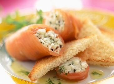 Corte várias fatias de salmão defumado, do tamanho que desejar (de preferência ao meio), recheie a fatia com a mistura de queijo e enrole. Use um palito para manter seus rolos firmes e armazene-os na geladeira até à hora de servir. Você vai ver como este delicioso aperitivo é consumido rapidamente.