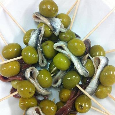Em um palito, espete uma azeitona. Em seguida, uma anchova dobrada ao meio e depois outra azeitona. Repita o processo com quantos aperitivos desejar fazer. As anchovas podem ser substituídas por sardinhas. Uma entrada simples, econômica e deliciosa.
