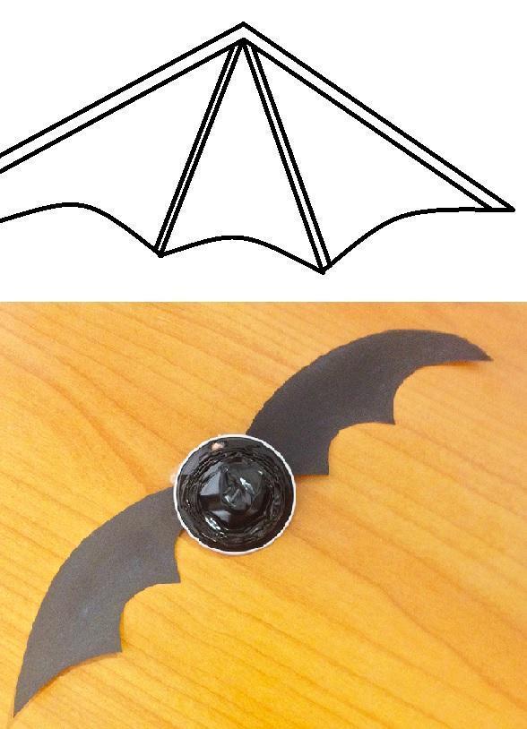Com a cápsula espalmada, já podemos começar a dar forma aos nossos morcegos com cápsulas de café. Um dos elementos chave deste animal sanguinário são as asas. Pode fazer as asas do morcego seguindo um padrão, como o da imagem, ou desenhá-las você mesmo como mais gostar. Desenhe as asas sobre o papel de cor preto, recorte-as e cole-as na parte de trás da cápsula com super cola. Como vê, o nosso trabalho manual com material reciclado começa a ganhar a forma de morcego.