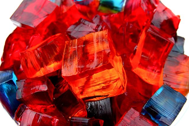 Finalmente coloque os olhos num prato sobre a gelatina vermelha, ou dentro da gelatina vermelha num recipiente maior. Aproveite e faça também outras formas e feitios de gelatina para criar uma decoração bem apetitosa.